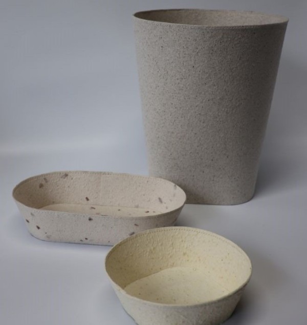 写真②和紙を張り合わせ、縫って作る、100%自然由来のトレーとくず入れ。(手前からミカン・ブドウ・ゴボウ)